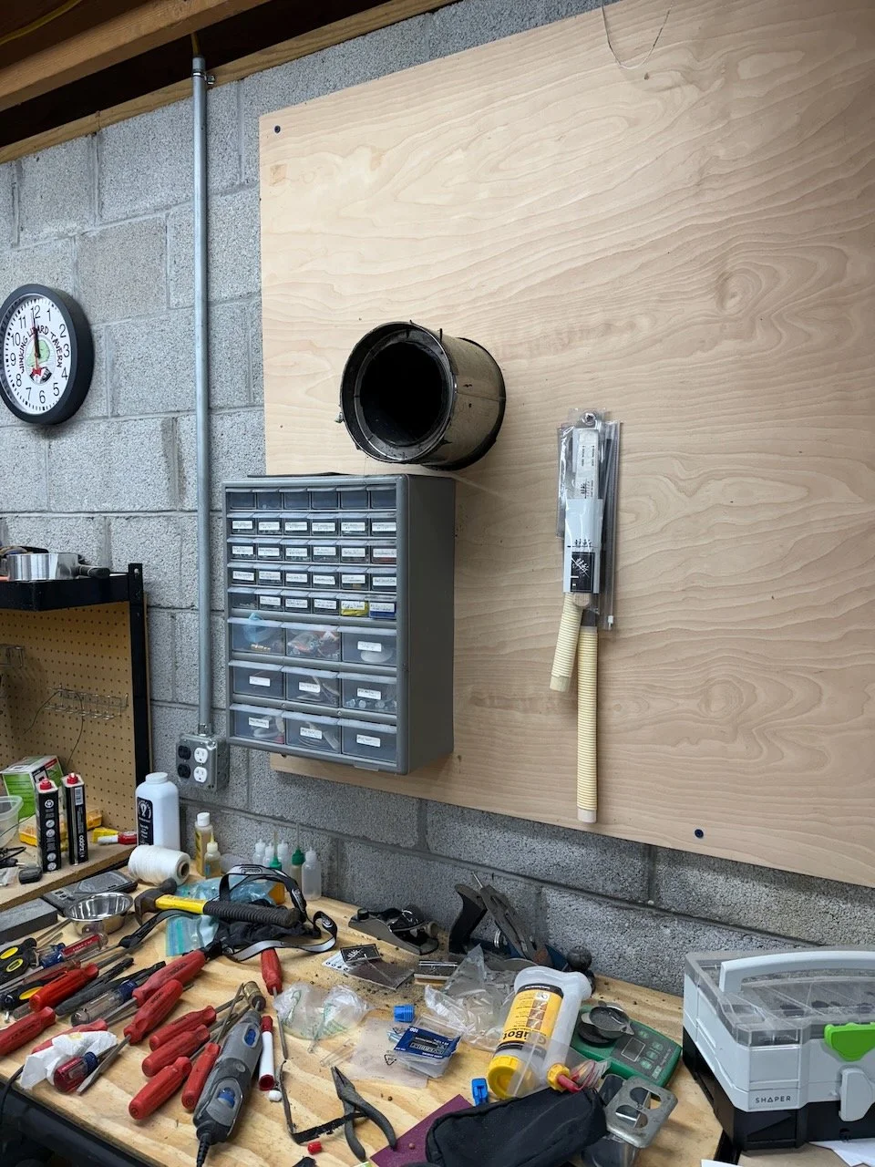 I went down this morning to finish setting up my jointer-planer. Except I heard a scratching behind the plexiglass that was covering the opening.